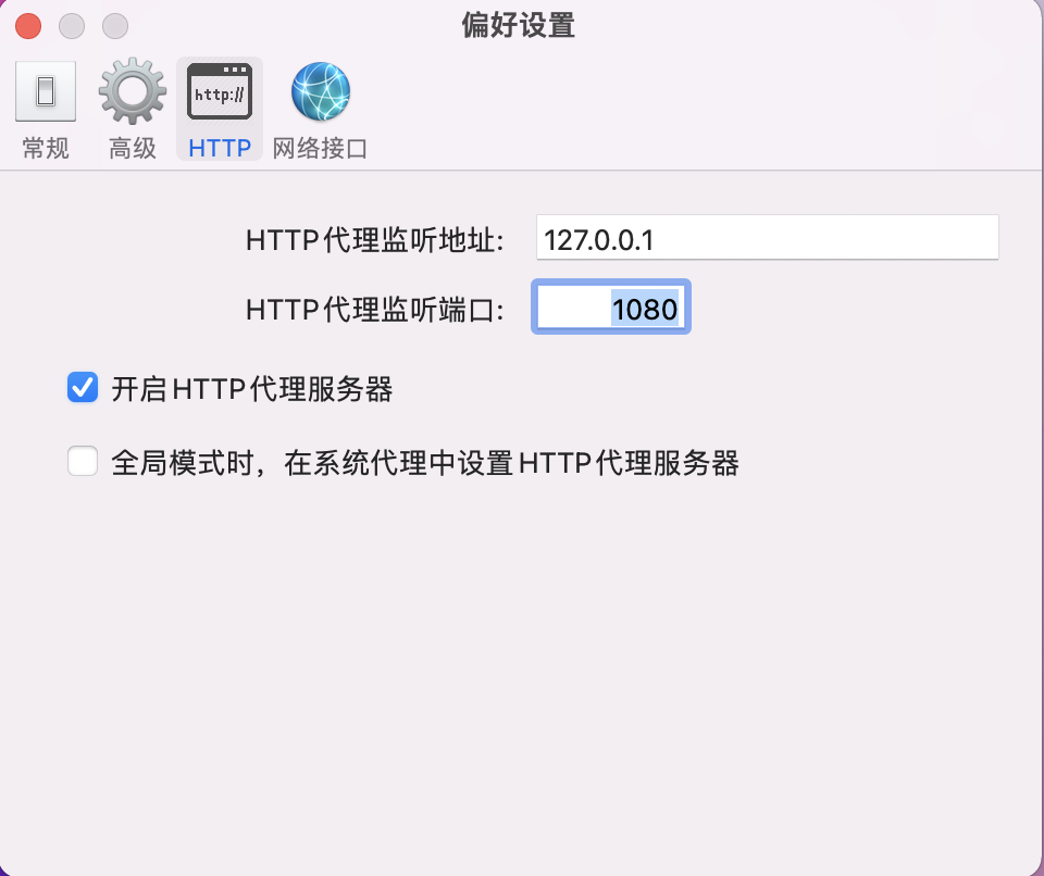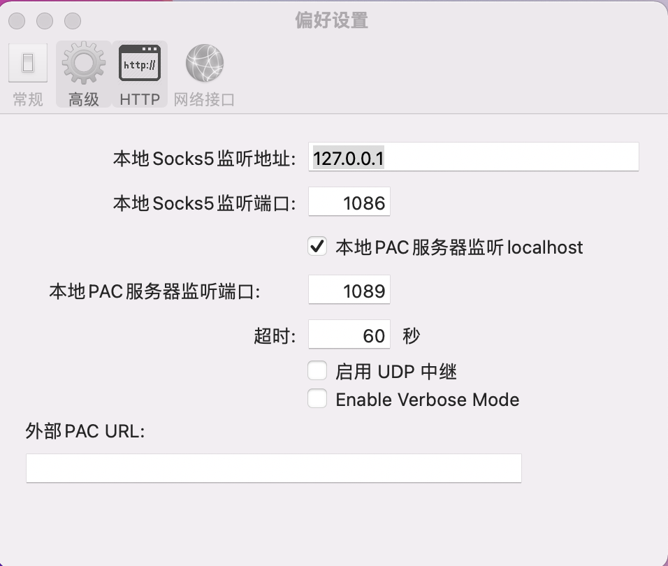 我本地安装了Shadowsocks,打开『偏好设置』可以看到socks5和http代理分别监听了1086和1080端口,如果把Iterm2中的请求转发到这些端口上,是不是就可以满足我们想要的功能呢?