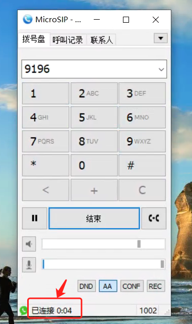 在拨号界面输入9196,然后点「呼叫」,等待一会儿,我们就可以看到有通话时长了,这个时候对着话筒说话,就可以听到自己说的内容。