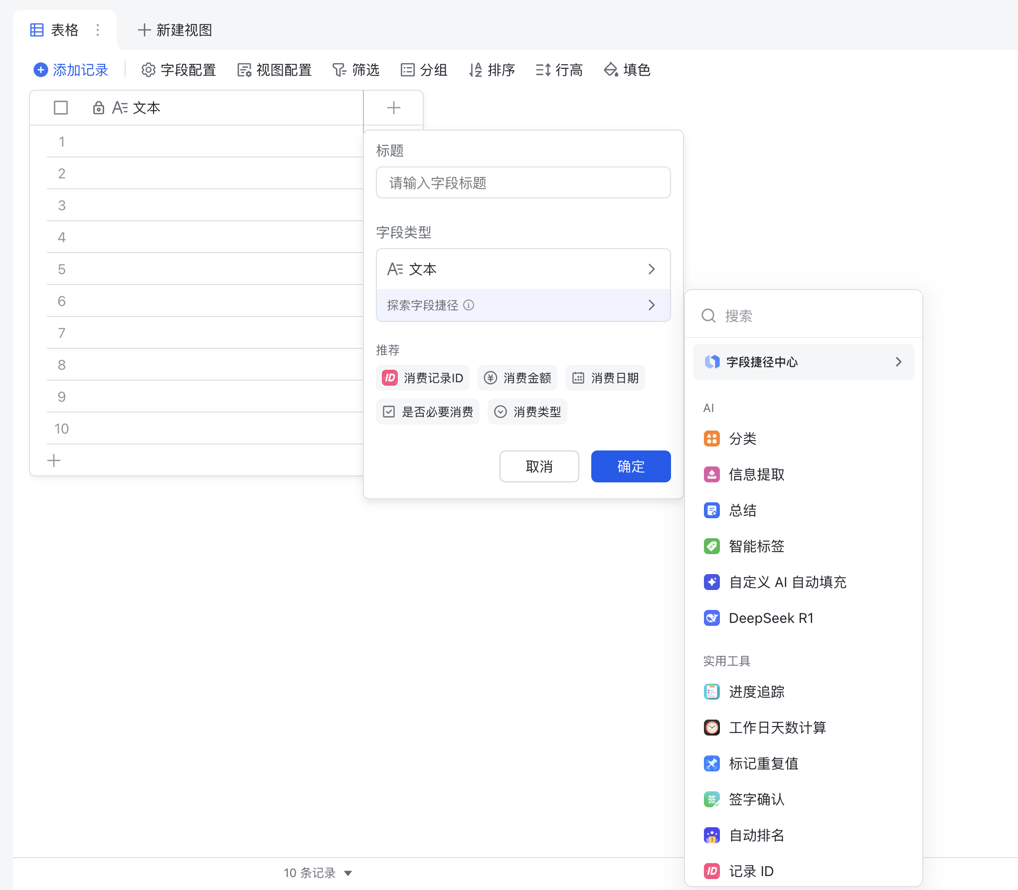 前段时间deepseek火了,飞书在多维表格中集成了deepseek-r1相关功能,我正好看到了新闻,所以想了解一下情况,多维表格中有一个功能叫”探索字段捷径”,这里提供了一些AI相关的功能: