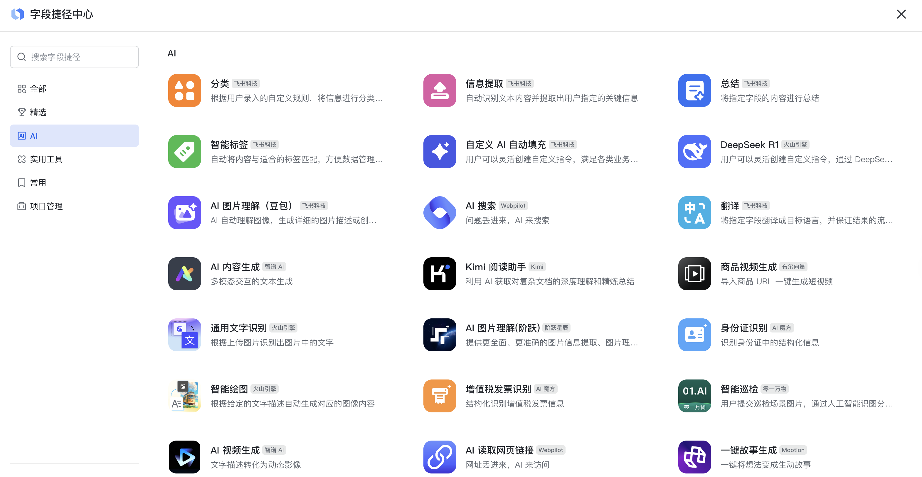 我点进了”字段捷径中心”,这里提供了不少AI相关的功能。