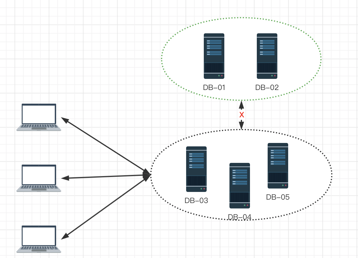 原本DB-01至DB-05是一个集群,但是由于DB-01和DB-02所在机柜的网络设备异常,导致和DB-03、DB-04、DB-05三个节点的机柜网络不通了,这就造成了所谓的分区。