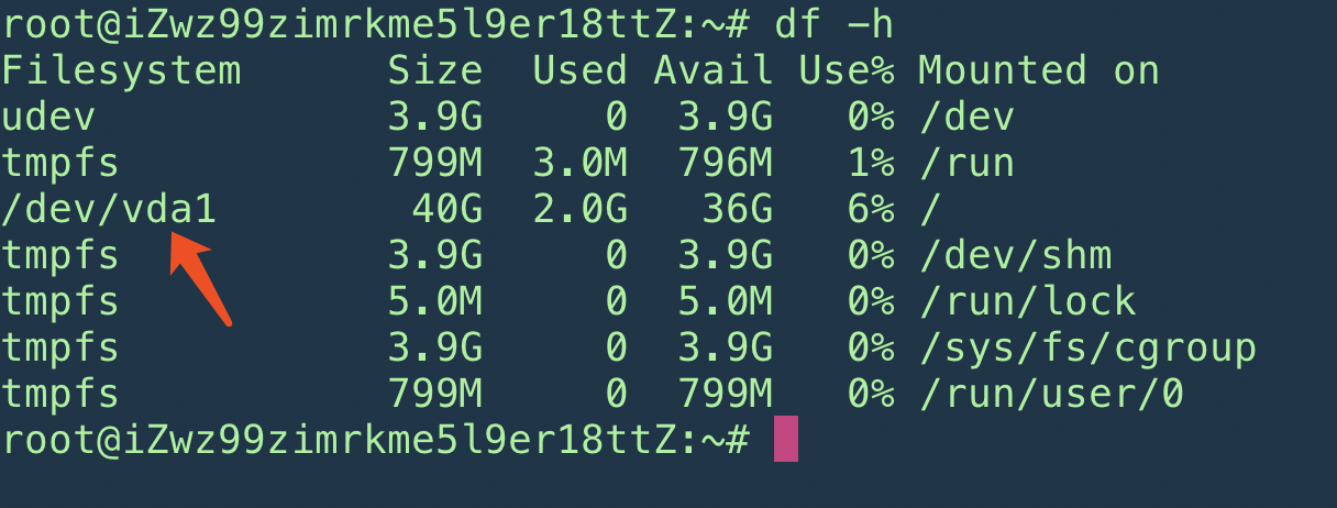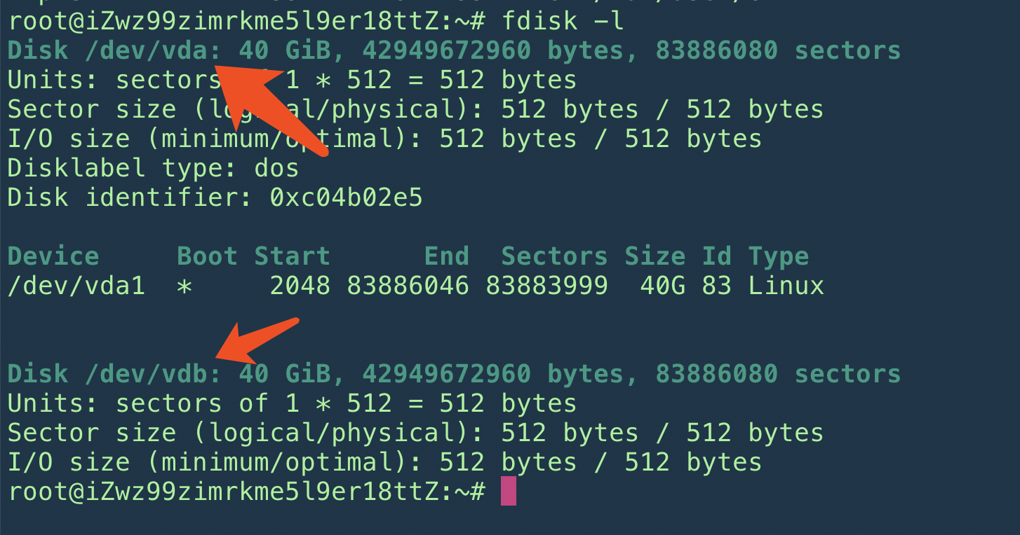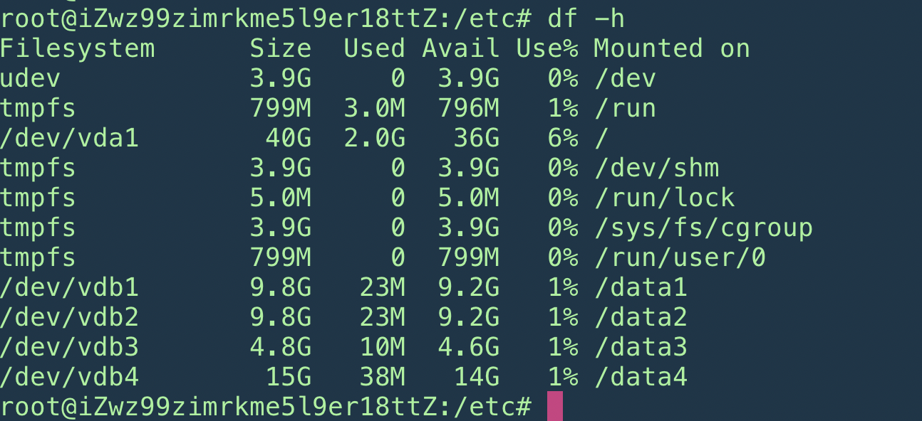 Ubuntu 16.04 64 两块磁盘,一个40G系统盘,一个40G数据盘。 本次实验是为了演示如何将40G的数据盘分成4个区,然后挂载到不同的目录下。 阿里云服务器磁盘信息如下:
