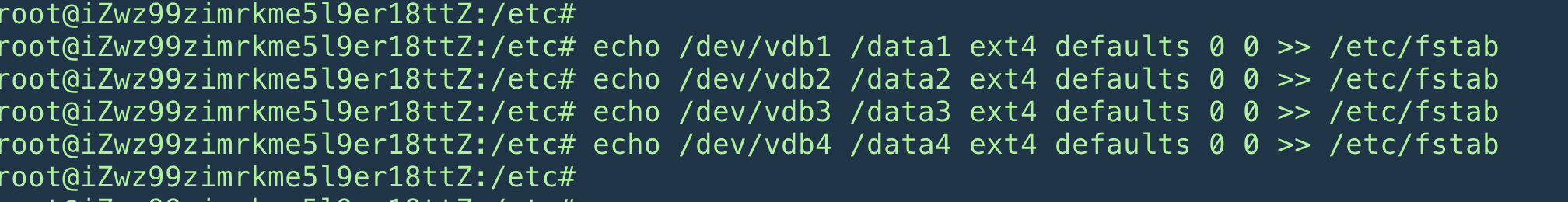 1 | echo /dev/vdb1 /data1 ext4 defaults 0 0 >> /etc/fstab |