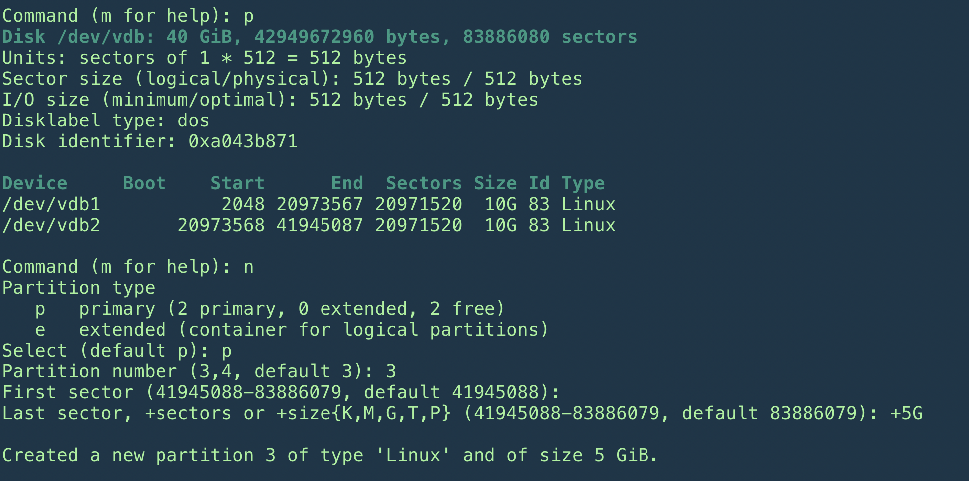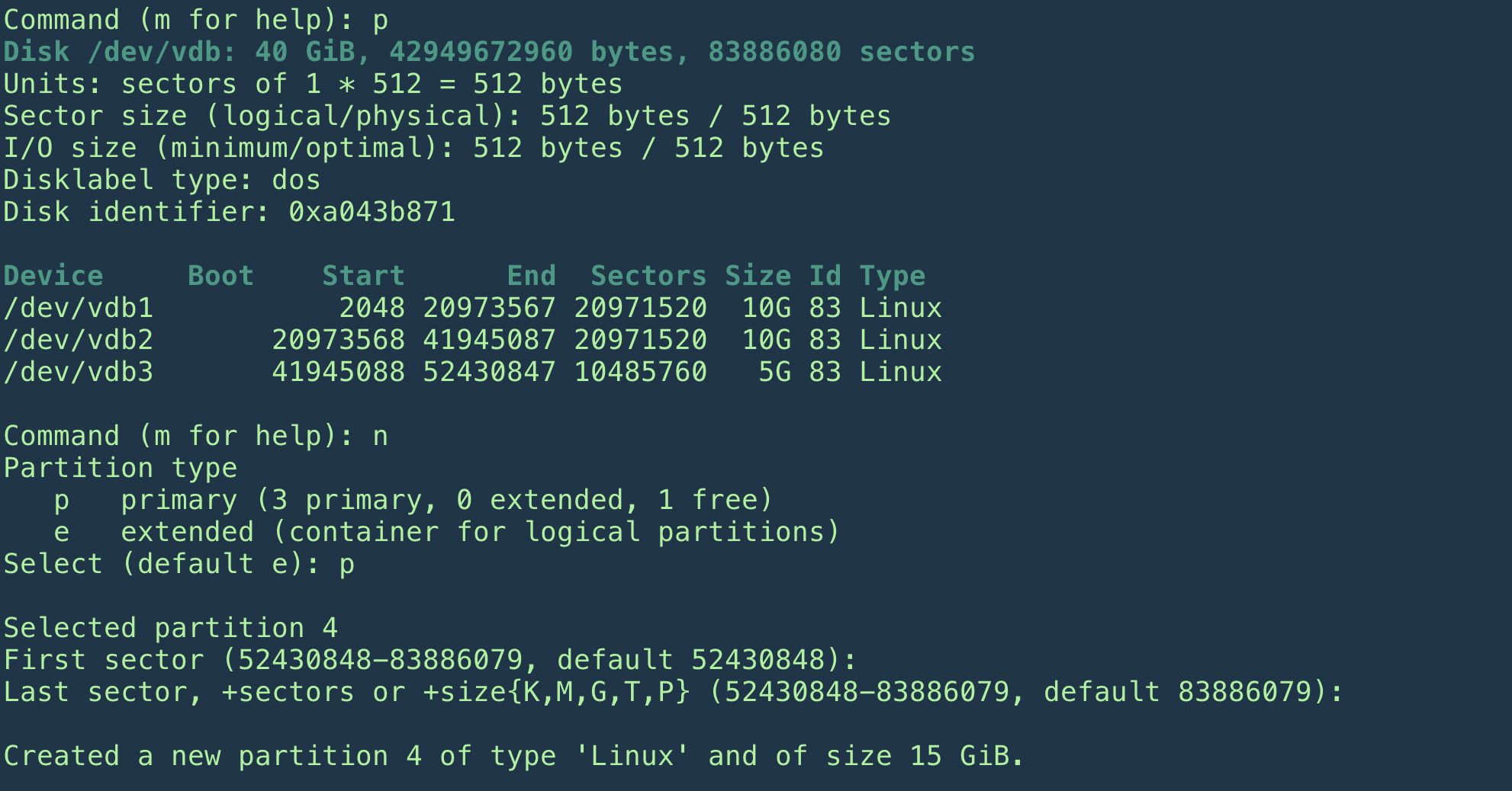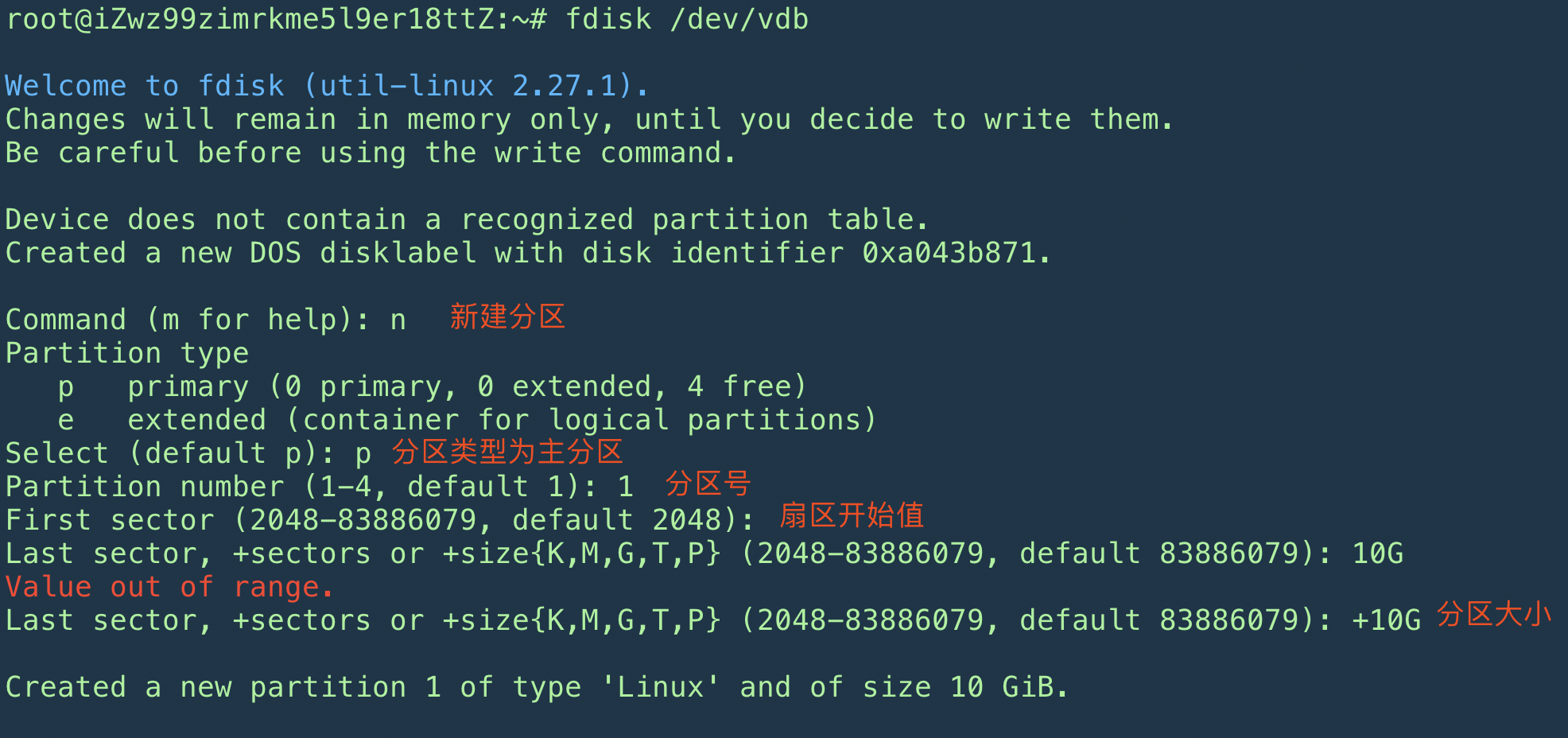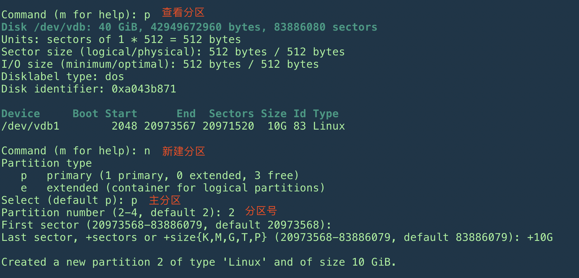 使用fdisk /dev/vdb命令来进行磁盘分区,/dev/vdb就是我们上面看到的没有被挂载的磁盘。