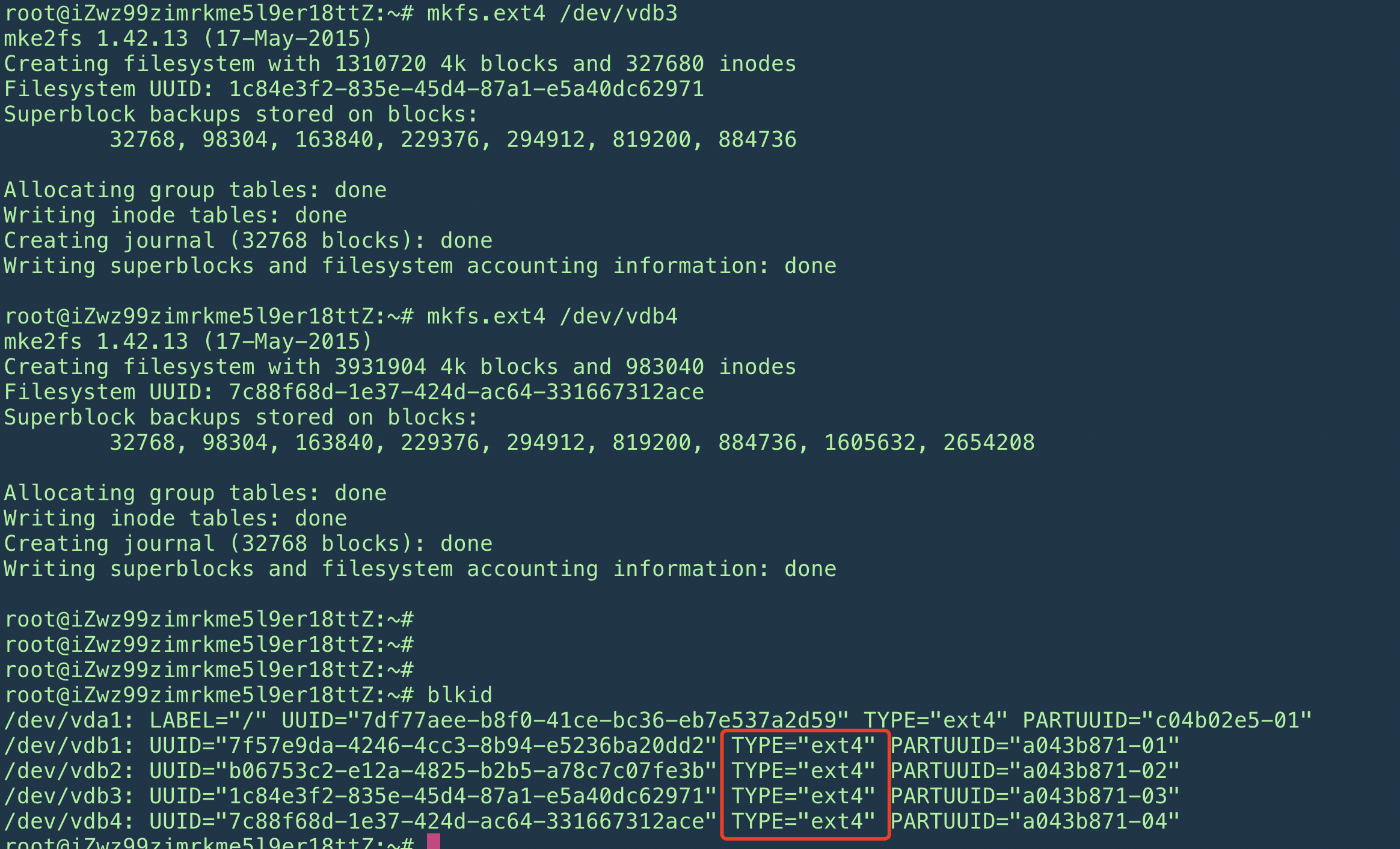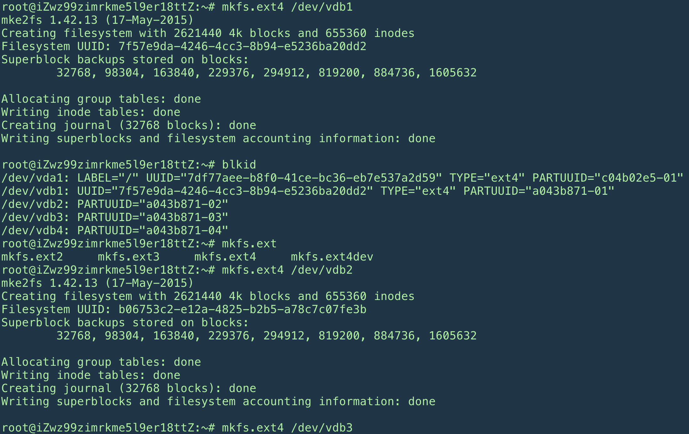 分区创建完毕之后,使用mkfs.ext4命令来对分区进行格式化,如下图所示,将分区格式化成ext4格式。
